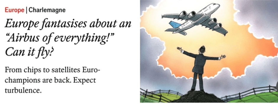 The Economist magazine’s Charlemagne column this week is a breezy piece in vintage Economist style: jump around, connect a few factoids, put forward a seemingly “contro” (and of course neoliberal) point of view, sign off. This time it’s about the apparent “trope” that “Europe Fantasises About an Airbus of Everything!” – that “no industry confab” in Europe is complete without a call for creating an “Airbus of something” (chips, green tech, satellites, cloud etc) – but really we need to resist all of this nostalgia for state support which is oh-so-1970s-glitterball, and most importantly is being pushed by corrupt politicians who want to cut ribbons and greedy entrepreneurs who want to make profits at the expense of consumers.[1]